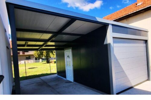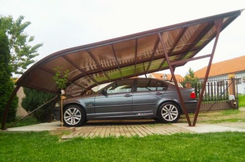 - Nadstrešnica može biti pokrivena visokokvalitetnim polikarbonatnim pločama (pune ili saćaste) ili limom/panelima.